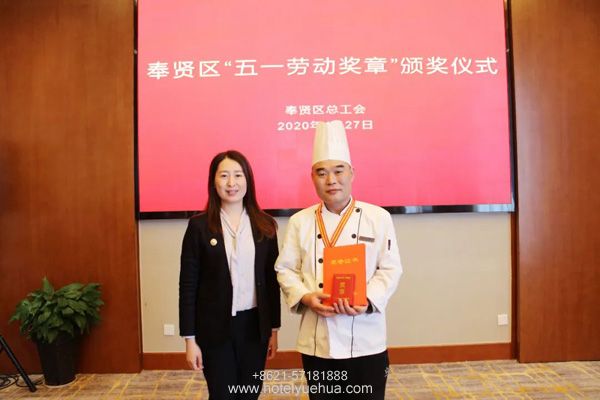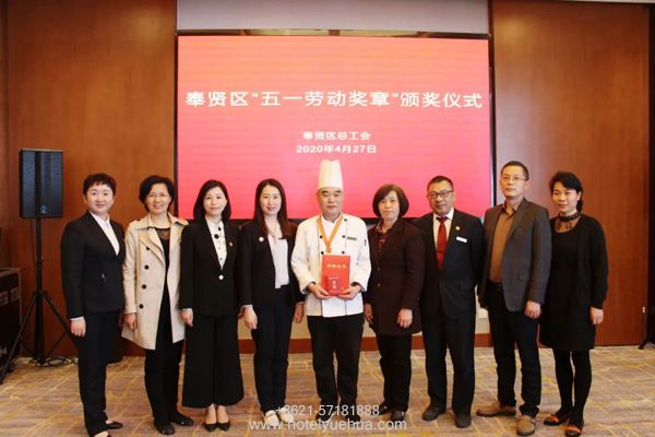 2020年4月27日,区总工会副主席许燕玲、南桥镇总工会主席高洁萍、区餐饮行业工会副主席张明等领导前往上海悦华大酒店给奉贤区五一劳动奖章获得者陆忠同志颁奖。