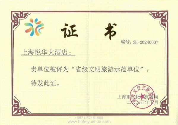 该荣誉是对上海悦华大酒店在高质量旅游服务方面的认可,也是对悦华在推广文明旅游、提升游客体验方面所做出的努力的肯定。悦华作为奉贤区首批五星级酒店,连续20年荣获“上海市文明单位”称号。